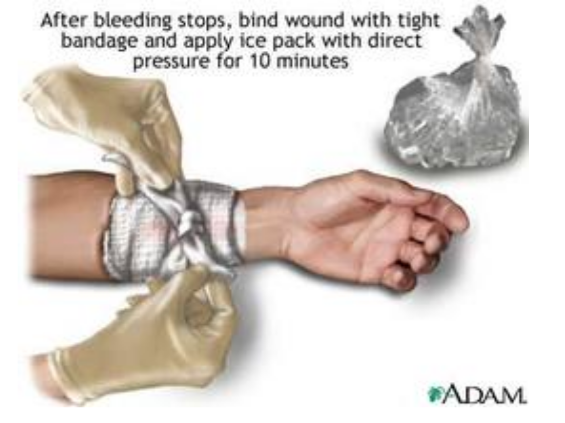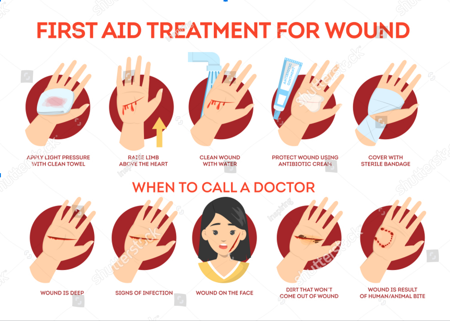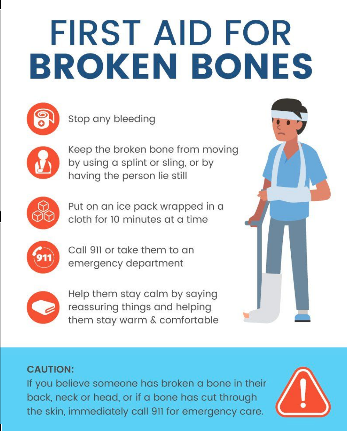 Principles of first aid against broken bone wounds The first aid principle to address a broken bone wound is through the fixation to rest/minimize activity of the two joints that flank the broken bone. This is necessary to prevent friction of the broken bone. Friction of a broken bone can aggravate the wound.