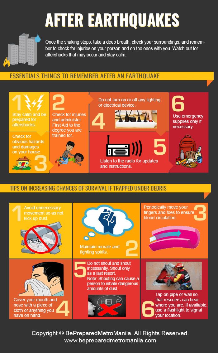 When the shaking stops, before you move, look around for things that might fall or for dangerous debris on the ground.